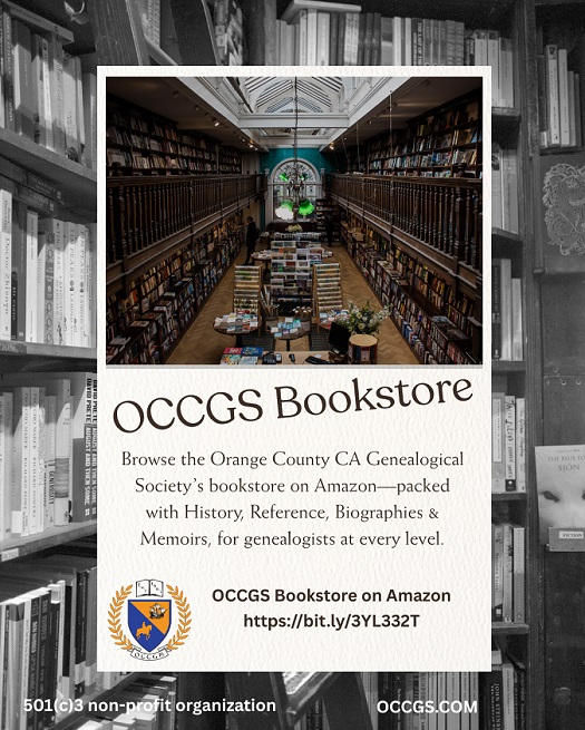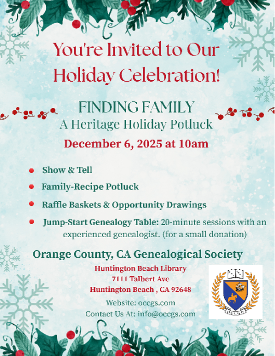 The Orange County California Genealogical Society (established in 1963) is a non-profit, educational organization in Huntington Beach with over 200 members. Read more...