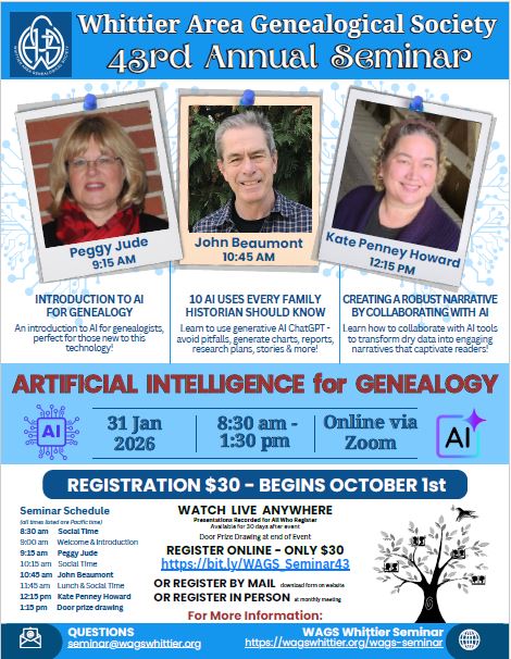 | Jan 31 | WAGS Annual Seminar | Artificial Intelligence for Genealogy | |
